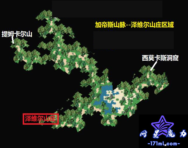 44、在山谷内找到西莫卡斯洞窟(174.158),进入洞窟沿路往西进入泽维尔山庄(20.159)。