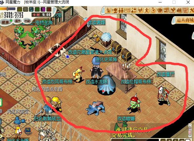 勇者大厅地下一楼,以下红色圈圈内的普通改造宠物任意三只 5档内的可随机合成一只白化宠物